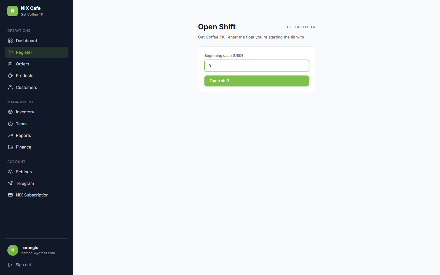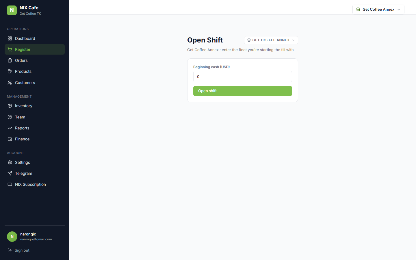 admin_operators ended up empty → admin login returned 401 for everyone for ~24h. Fixed out-of-band by inserting one operator row (id=1, email admin@nixoutdoor.com, role super_admin, password unchanged from prior prod). Open follow-up: add an idempotent admin seed to nix-outdoor-sales-backend/migrate.js so the next fresh DB doesn't repeat this.is_active. Cpanel "delete shop" is a soft-disable (sets is_active=false, preserves the row), but nix-cafe/lib/db/shops.ts::listAccessibleShops read shops by tenant_id only — soft-disabled shops still appeared in the cashier picker, the commerce ShopSelector, and the daily-report scope filter. Fix: and(eq(tenantId, …), eq(isActive, true)).is_active filter, the picker would lag a minute behind a Cpanel disable until the cache expired. Wrapped listAccessibleShops in db.transaction() per project_hyperdrive_cache_stale_reads.md — bypasses the cache so ops disables reflect on the cashier UI immediately.POST /admin/tenants/:id/shops created the "annex" shop; DB ground truth confirmed 2 shops./cafe/pos, owner with 2 active shops sees register-shop-picker dropdown (single-shop label gone).DELETE via admin API → DB row keeps is_active=false; /cafe/pos picker collapses back to single-shop label without the 60s Hyperdrive cache lag.
