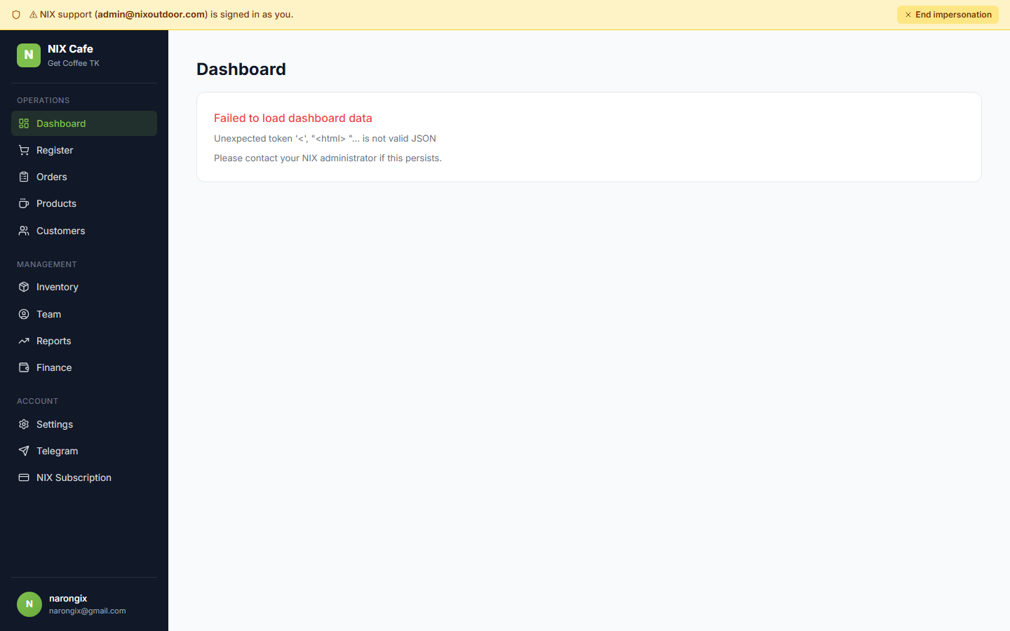 2026-04-29 on prod. Admin-initiated tenant_user impersonation, end-to-end across 5 repos. NIX support clicks "Sign in as" on a tenant user in Cpanel → backend issues a 30-min JWT with an imp claim referencing a new commerce.impersonation_sessions row, sets the shared nix_session cookie on .nixtech.app, returns a redirect URL → admin lands on the tenant subdomain authenticated as the target user, with a sticky amber banner on top of every authed page (Cafe, Commerce, Outdoor) carrying their admin email + an "End impersonation" button. Tenant-side end and admin-side revoke both mark the row ended_at + ended_by, after which the cookie's JWT no longer authenticates anywhere.